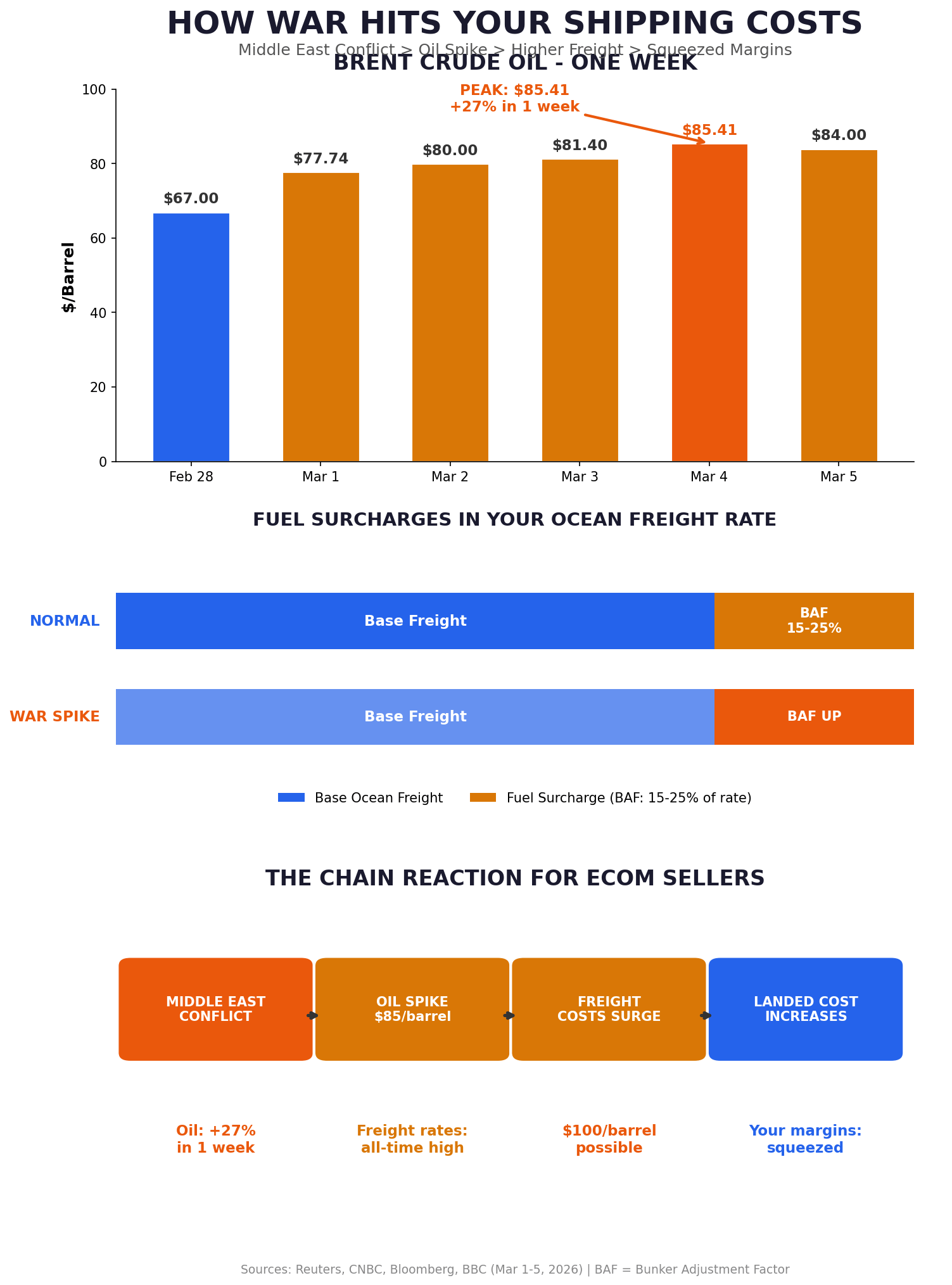 Today's conflict has already pushed Brent crude up 27% in one week. The supply chain impact is arguably worse now because ecom sellers depend on ocean freight, and fuel surcharges hit your landed costs directly.
